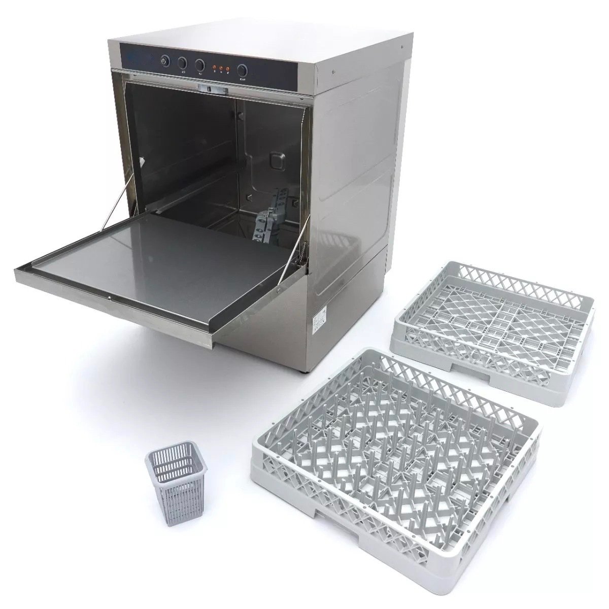 Com um consumo de 2,8L de água por ciclo, esta é uma máquina de lavar loiça muito económica. Também é seguro trabalhar com ela, graças à protecção térmica. O painel de controlo está protegido por IPX4, para que a água não fique atrás dos botões. Também é fácil de usar: há um único botão On/Off, um segundo botão para Iniciar/Pararar o ciclo de lavagem, e um terceiro botão para definir o programa de lavagem desejado. Três luzes indicadoras mostram quando a máquina de lavar loiça está pronta para começar e quando o programa de lavagem está em curso. Os pratos são lavados a 60°C e enxaguados a 85°C, pelo que secam rapidamente. Esta máquina de lavar loiça vem com um cesto de vidro de 50 x 50cm, um cesto de prato de 50 x 50cm, um cesto de talheres, e uma mangueira de abastecimento e escoamento para ligar o aparelho ao abastecimento de água. Esta máquina de lavar loiça vem com uma bomba de enxaguamento, mas sem bombas de sabão e escoamento.